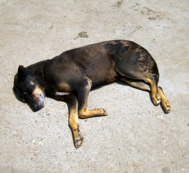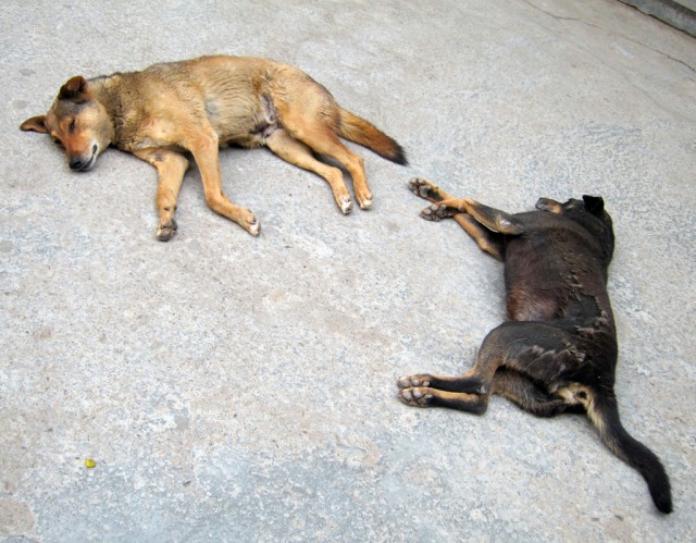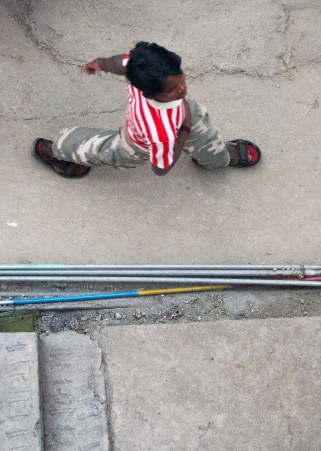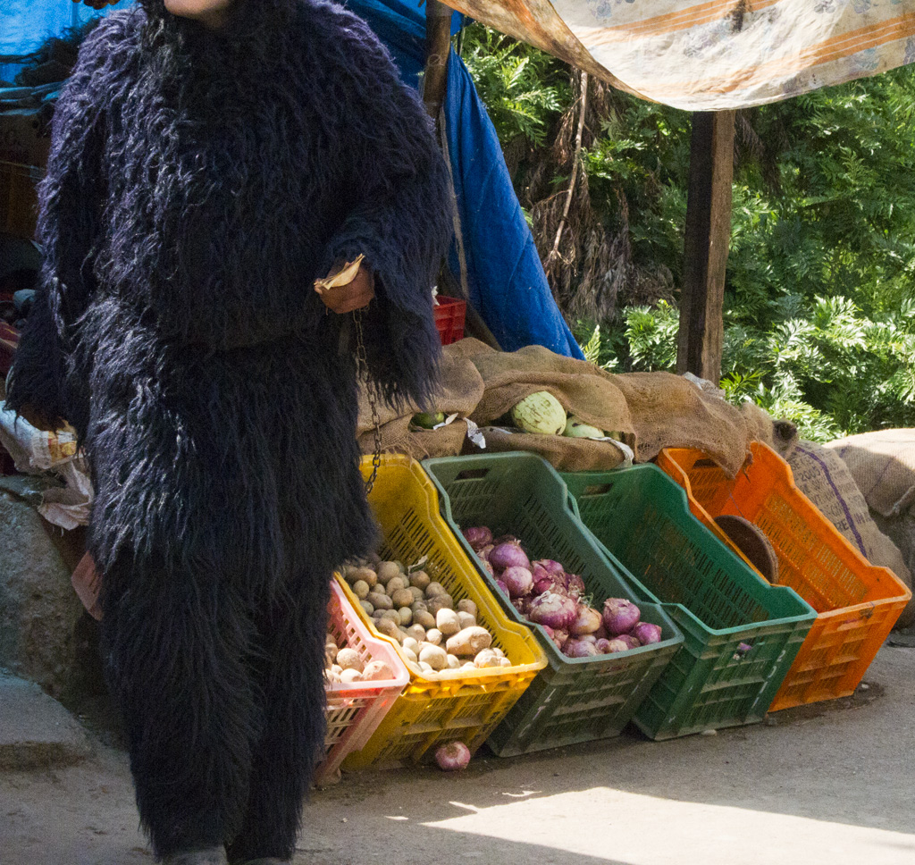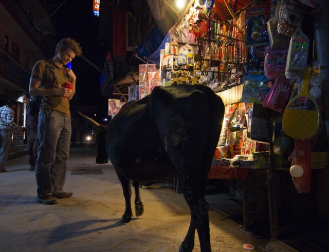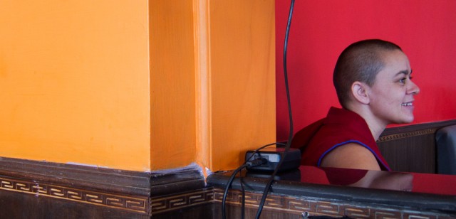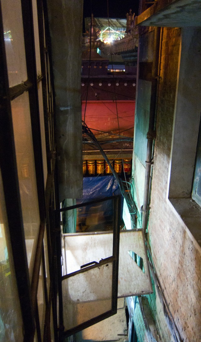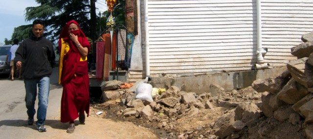All these layers but no boundaries. Thickly bundled water pipes weave along unpaved walkways and trash-stuffed sewers. Cows amble along outer monastery corridors, tugging at bags of refuse, disrupting the sleeping dogs sprawled in the summer heat. Cats slink from railings to rooftops. The bazaars are crammed with monks, nuns, beggars, and Western tourists clad in identity-altering shawls. Three- and four-wheeled taxis navigate the humanity like rafts on rapids, their horns—ranging from beep to blare—strike the offbeats between sparrows and crows. There are more stable sonic strata: rumbling generators, Tibetan longhorns, amplified chanting from the main temple, and a thousand conversations. Above, electrical lines intertwined with tree branches form skyways for feuding monkey clans. Still higher, birds of prey circle the snow-covered peaks. A welcome breeze disrupts the power, the Internet connection is lost. Life here carries on.