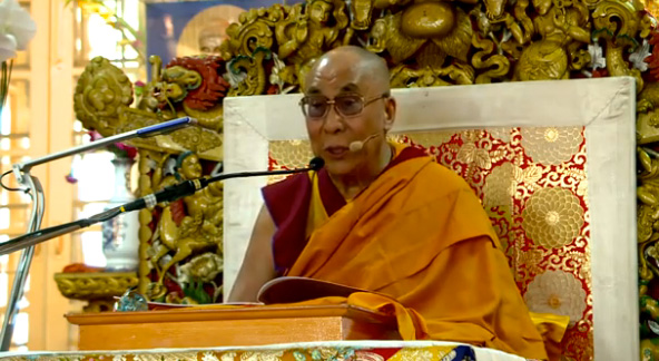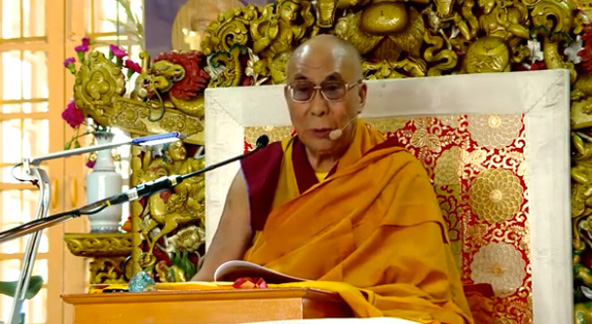 This teaching was translated sequentially (as opposed to simultaneously), so His Holiness spoke in Tibetan for 5–10 minutes, followed by the Hindi and English translators, and then back to Tibetan. Because the translators are speaking different languages, they don’t necessarily finish at the same time. Sometimes, the Tibetan resumes while the English is still going, in which case we emphasize the English audio until finished, then switch back to Tibetan.