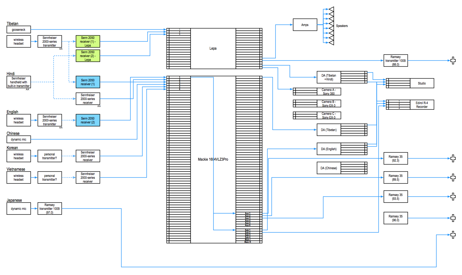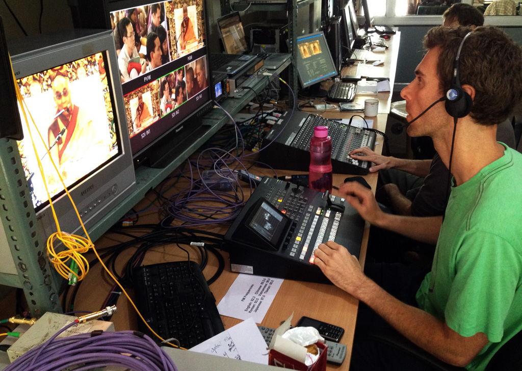 As with most teachings at the temple, there are simultaneous translations in multiple languages. This can get pretty complicated, with the mixing board routing up to seven different translators to an array of recording and streaming equipment (yay, Mackie!), not to mention FM transmitters and their corresponding antenna on the roof.
