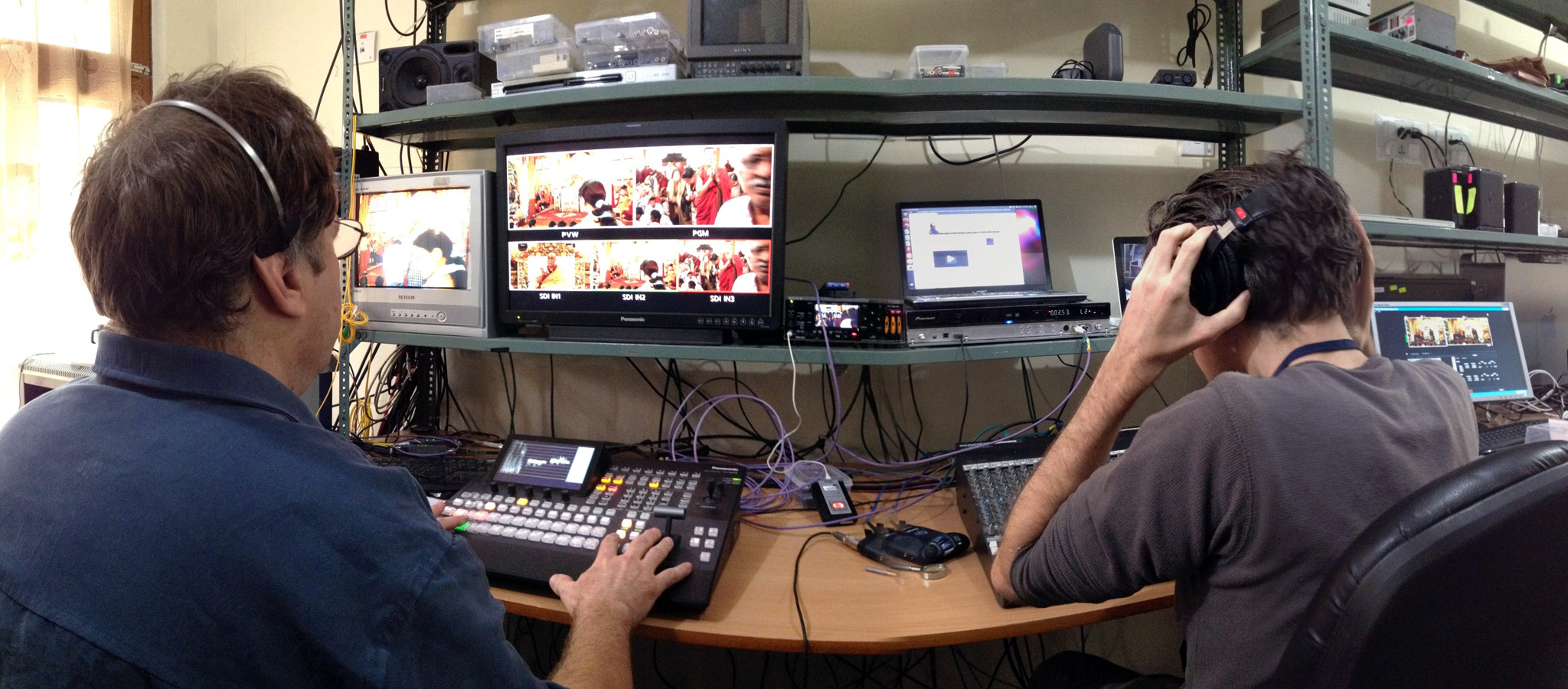I helped set up the day before, but hadn’t planned to go in for the teaching. I was looking forward to watching the streamed video knowing that Bennett (who left the house at six that morning) was, literally, the one calling the shots. The phone rang at 7:30. “The person who was supposed to run the audio mixer can’t make it—can you come down?”