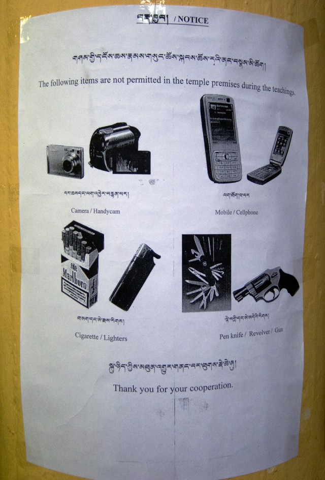 Buddhism may have originated in India, but when the pot finally stopped boiling over into neighboring Asian countries during the Middle Ages, there was virtually nothing left inside. Despite the large Tibetan community living in India since 1959, there have been few teachings for Indians. That’s why this teaching—conveniently scheduled during our last three days in town—is a notable cultural milestone: an Indian-organized Buddhist teaching. It’s a technical milestone too: the first full HD shoot at the main temple.
