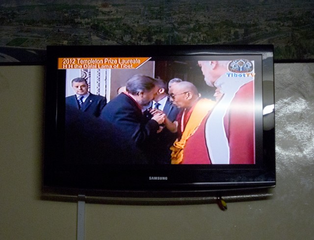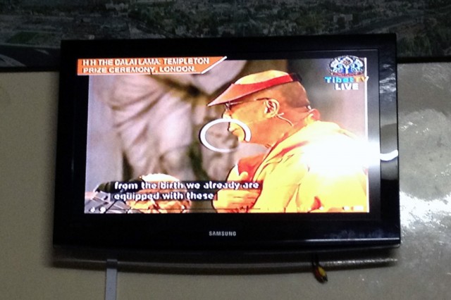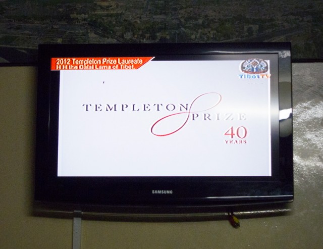 This evening, people gathered at Snow Lion to watch the Dalai Lama receive this year’s Templeton Award. He is donating the money to an Indian organization called Save the Children, the Mind and Life Institute, and to a fund for educating Tibetan monks about science.