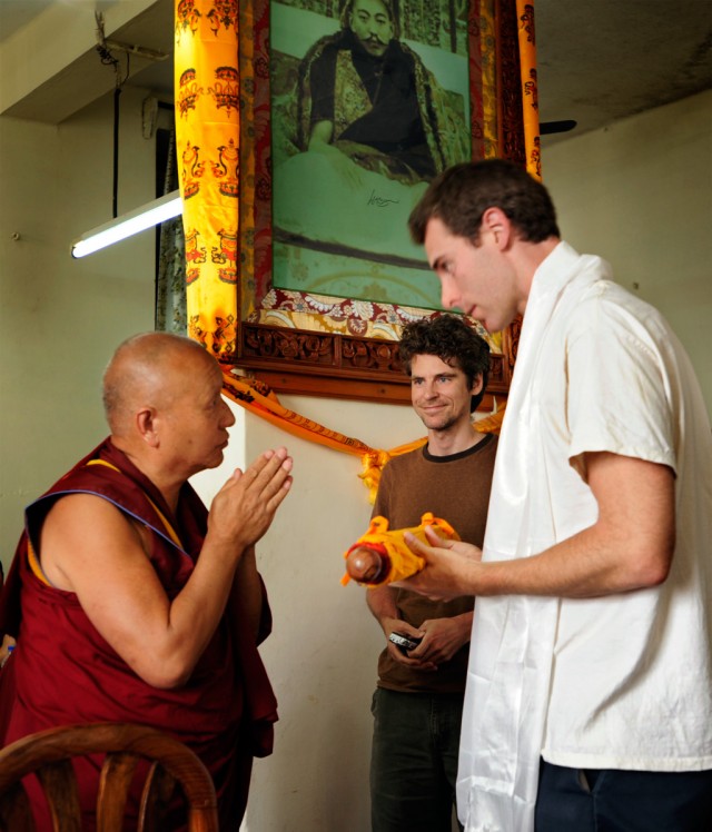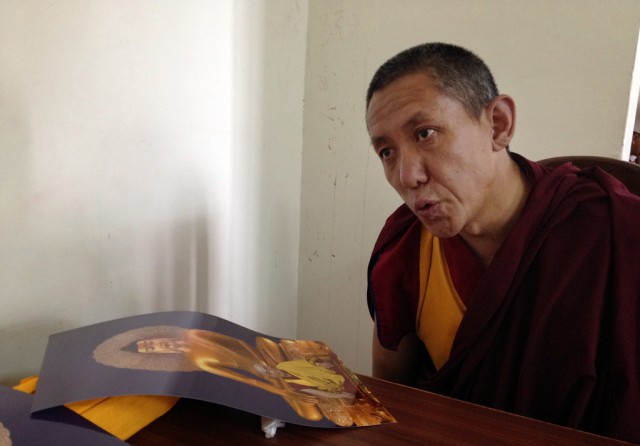 After we sat back down, a monk distributed photos of the Dalai Lama sitting in front of a large Buddha statue. Lobsang explained…