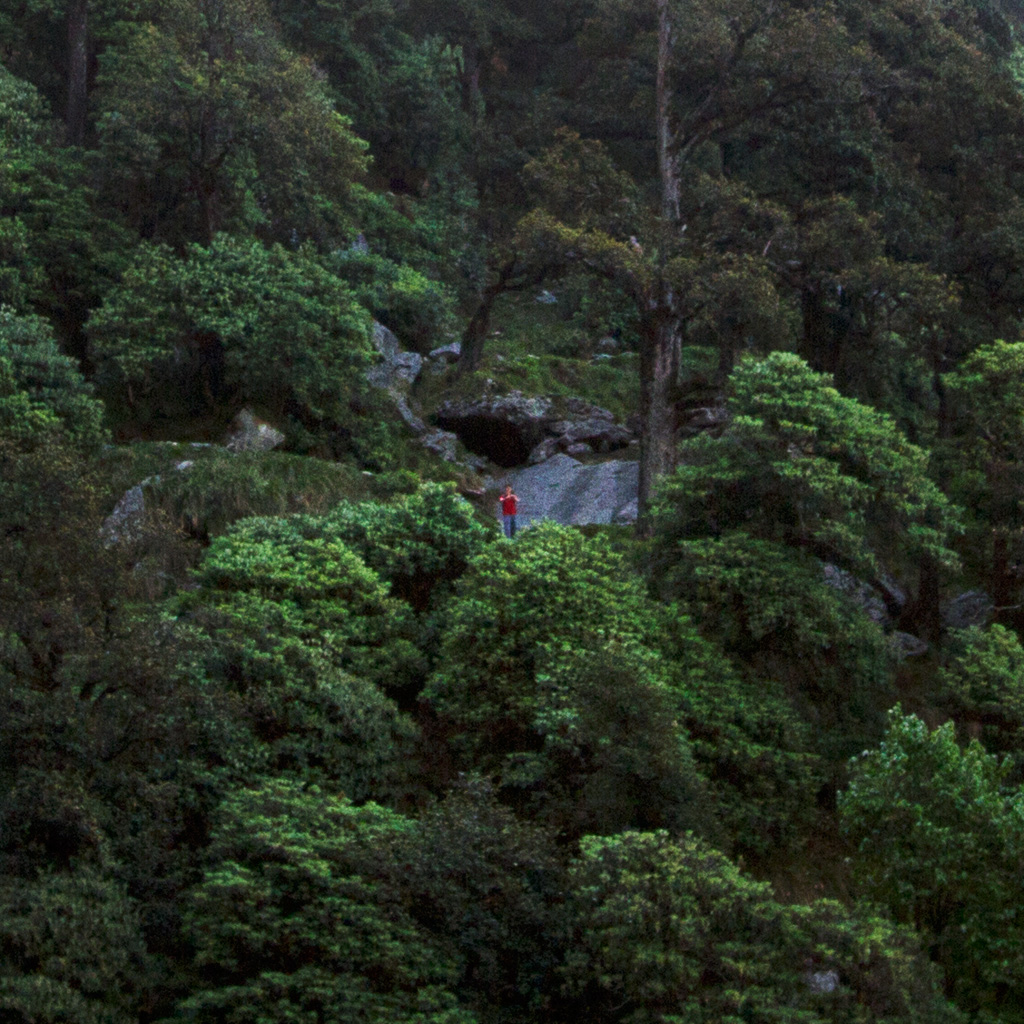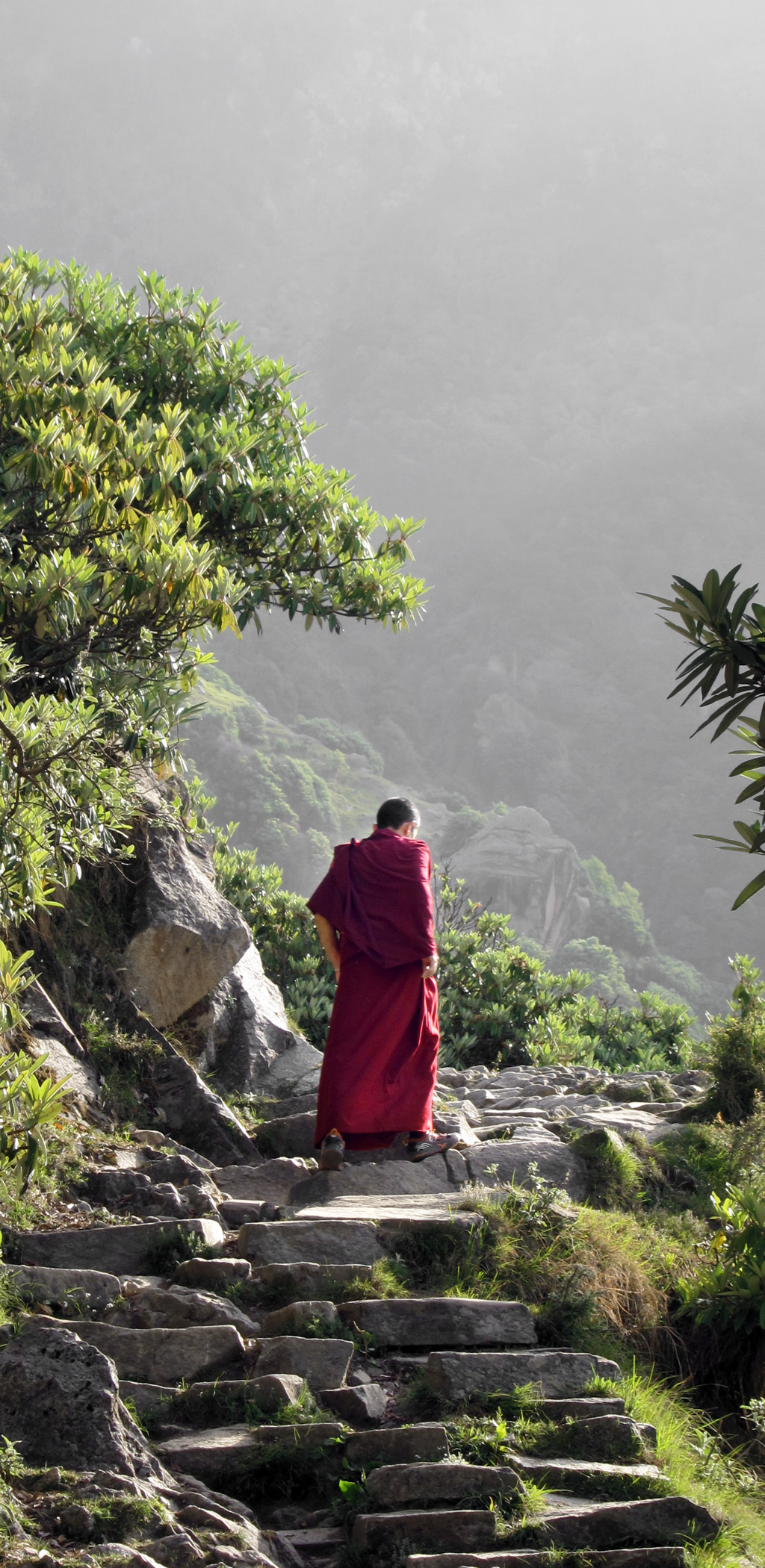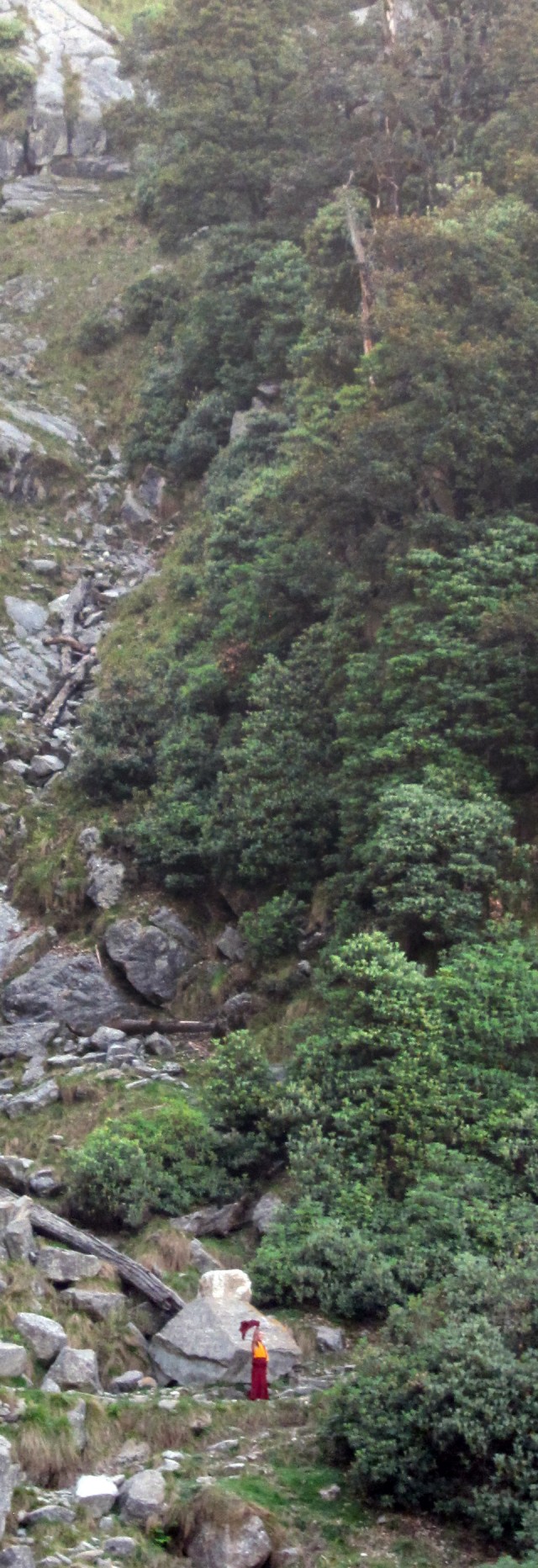 Lobsang moved up the mountain at lightning speed, so most of the trip he was just a tiny speck of red against the green cliffs. I even mistook him once for a distant flowering plant until I saw he him waving.