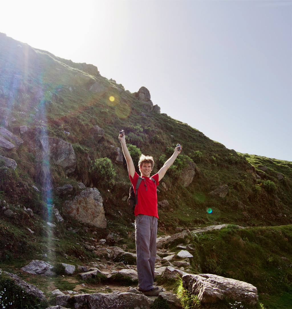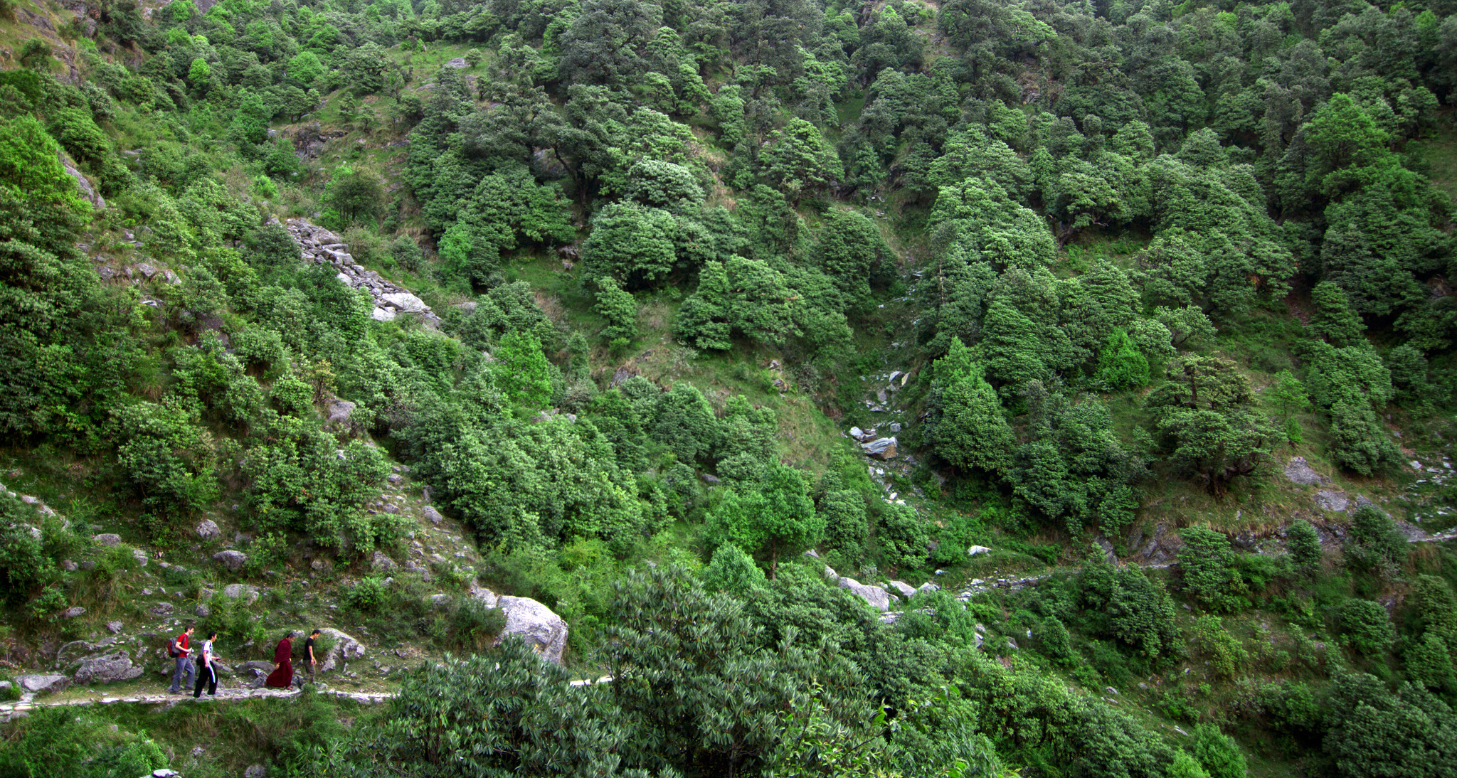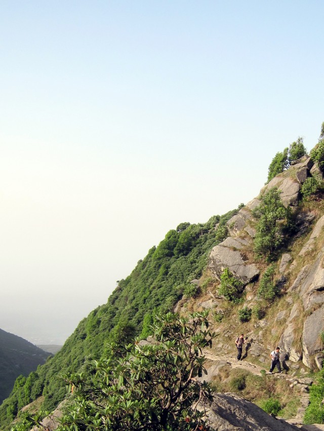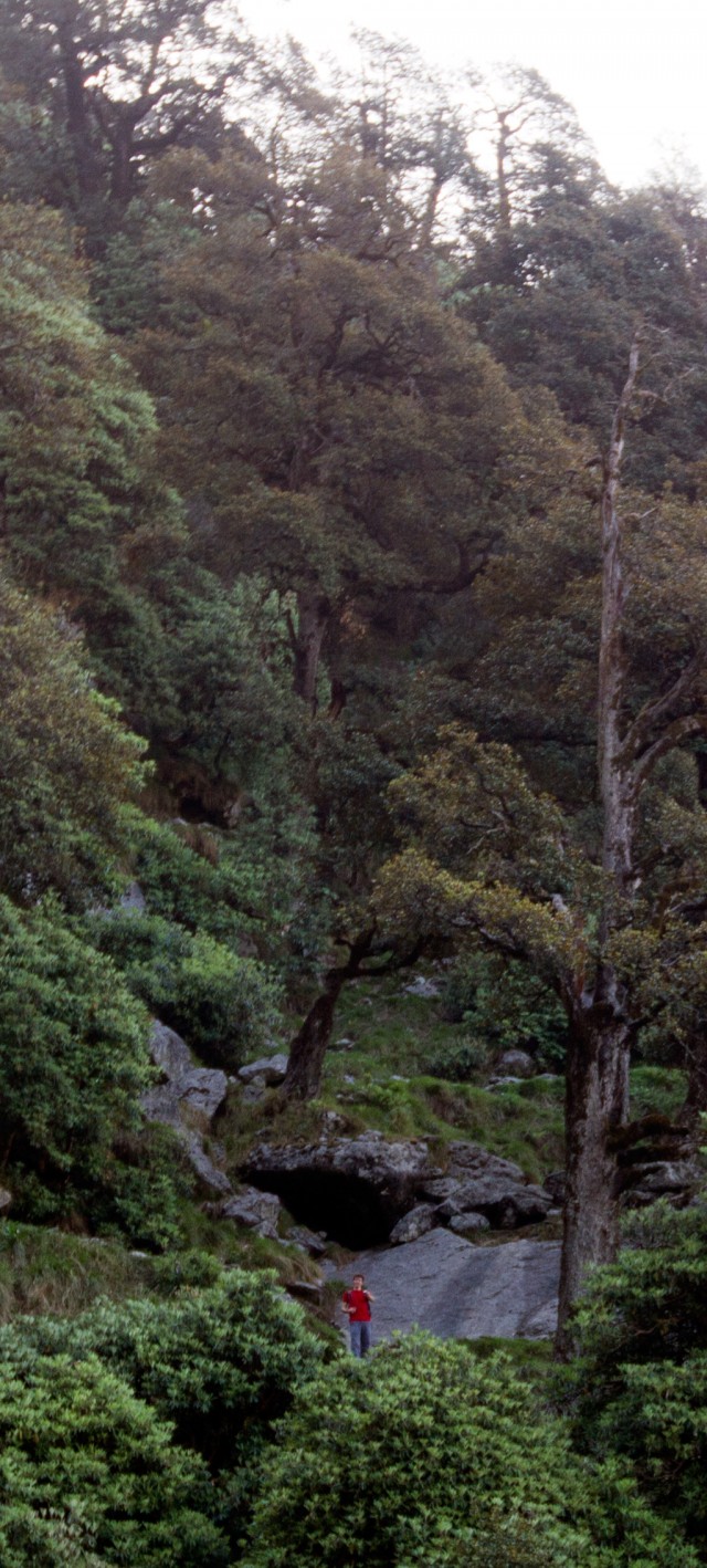 Lobsang moved up the mountain at lightning speed, so most of the trip he was just a tiny speck of red against the green cliffs. I even mistook him once for a distant flowering plant until I saw he him waving.