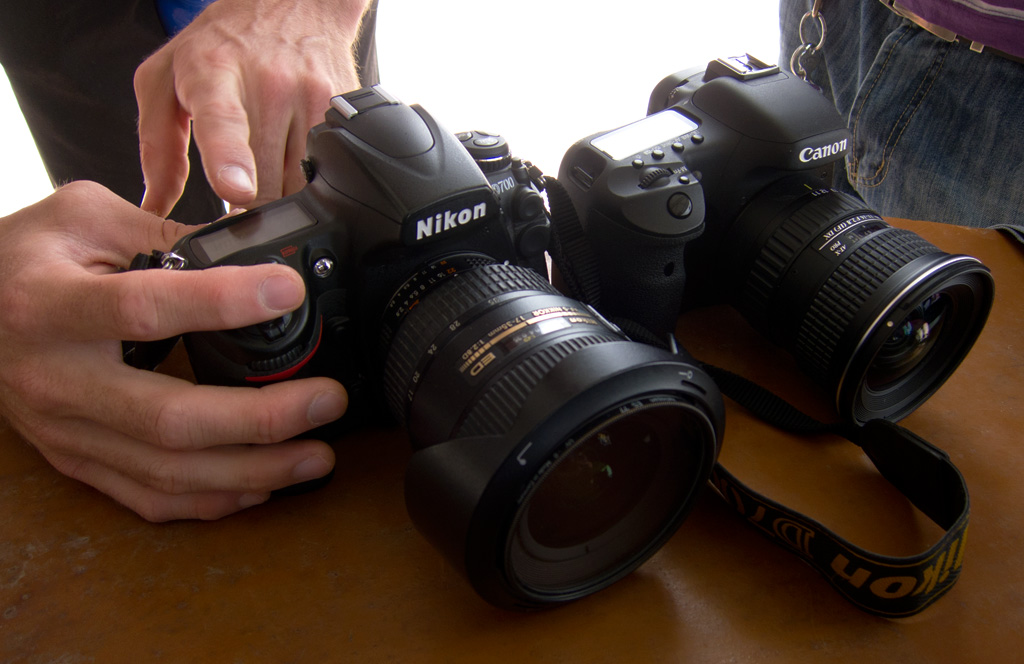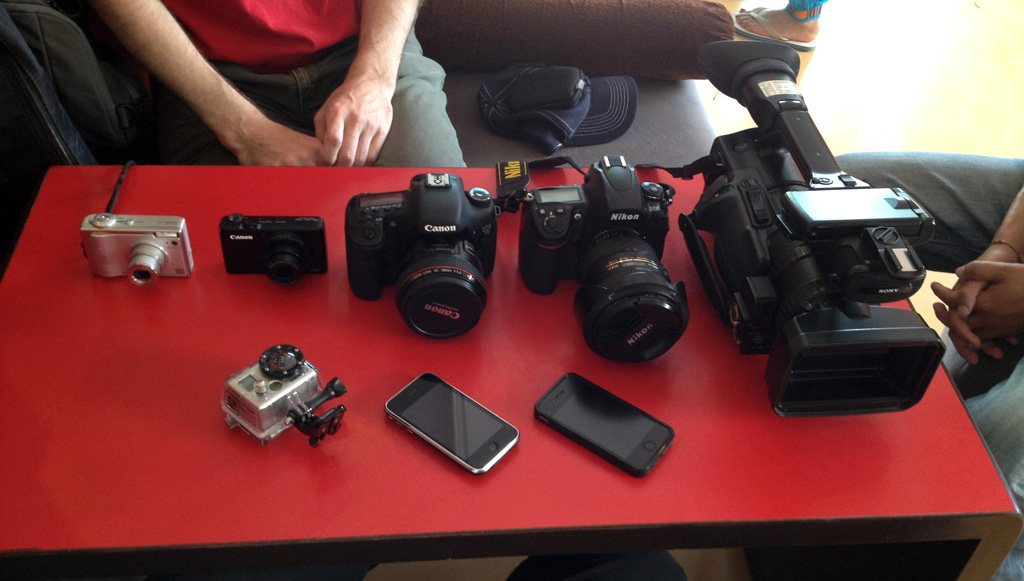 Left to right: Fuji FinePix F10, Canon S90, Canon 7D, Nikon D700, Sony HVR-Z1U, GoPro HD Hero, iPhone 3G, iPhone 4S