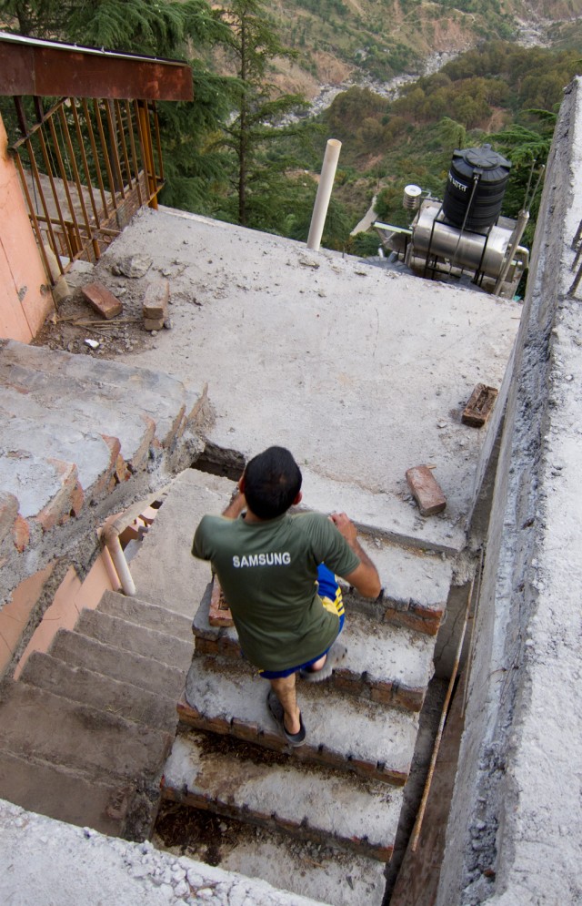Here is Mr. Singh’s assistant, heading up to the roof to start the water pump. In the background, you can see a water tank on a building below, and still further down is the river, which is practically dry this year.